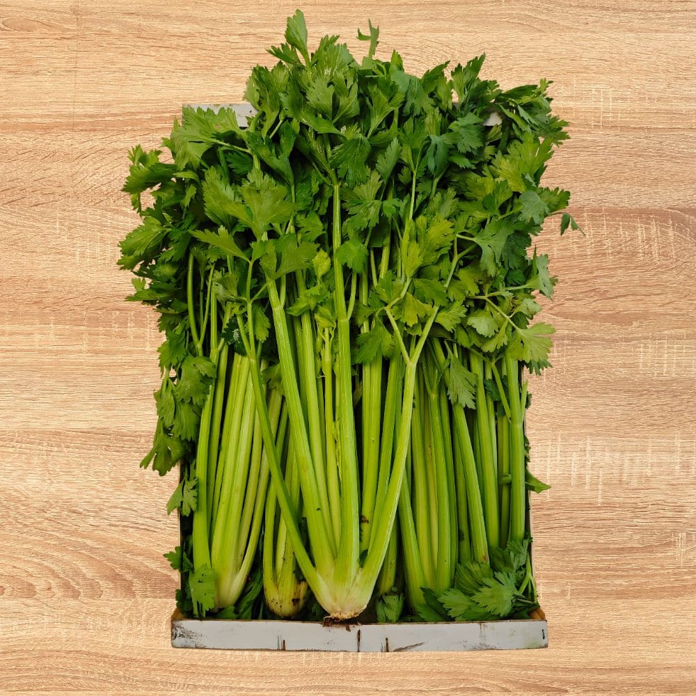 Apio fresco en caja para venta al por mayor en Valencia. Tallos firmes, color verde intenso y excelente conservación. Ideal para fruterías, supermercados y hostelería por su alta rotación y versatilidad en cocina profesional.